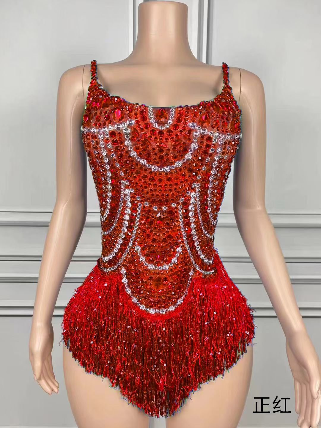 Crystals Tassel Bodysuit Sexy Dance Show Costume Carnival Party Stage Leotard