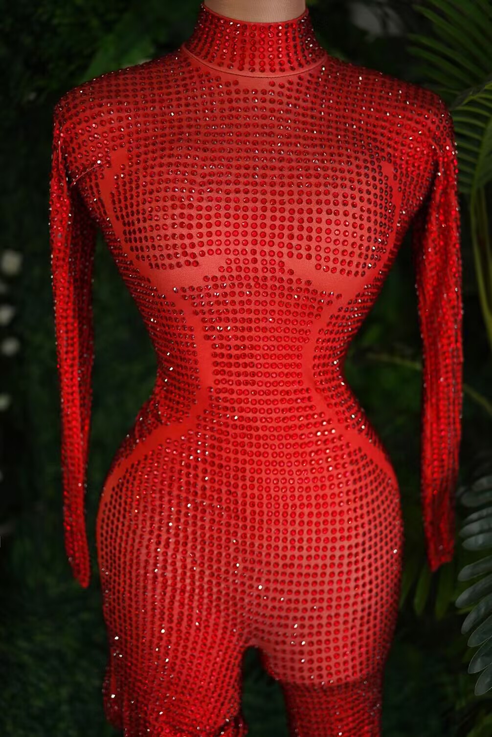 Siya Long Sleeve Rhinestone Jumpsuit Red