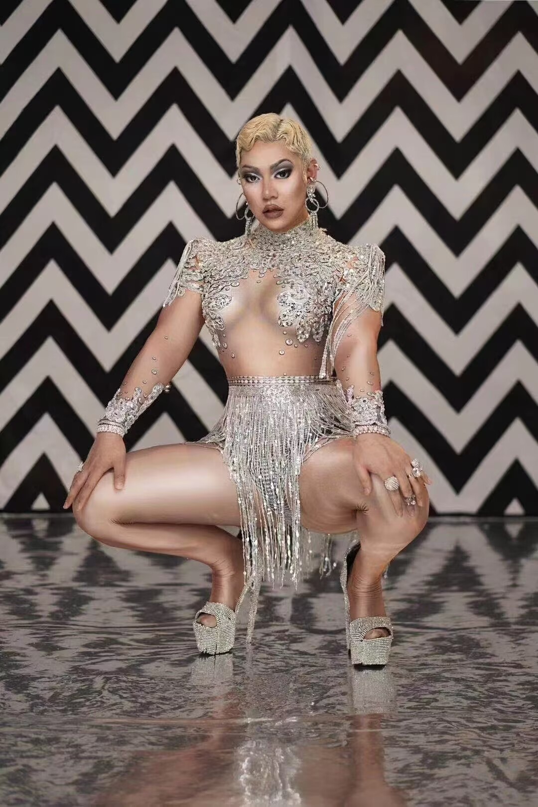 Shining Crystal Bodysuit Outfit – Silver Rhinestone Fringe Tassel 2-Piece Set, Sexy Festival Clubwear, Spandex Latin Dance Costume